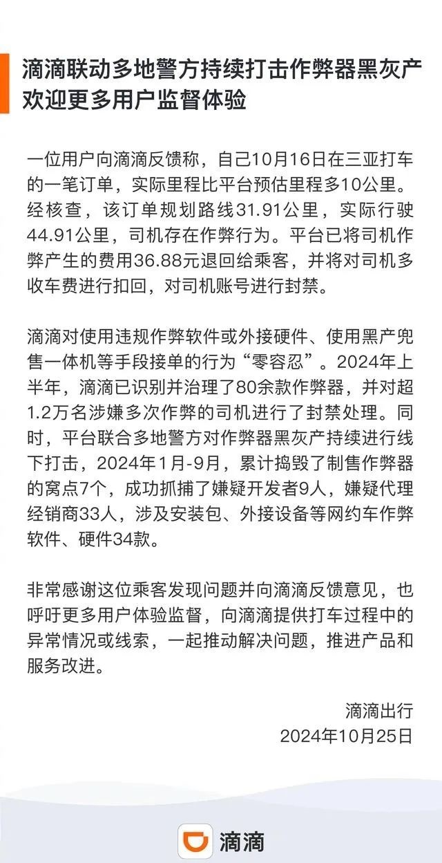 10月25日,滴滴出行宣布,今年上半年已识别并治理了80余款作弊器,并对超过1.2万名涉嫌多次作弊的司机进行了封禁处理。这一行动是滴滴与多地警方紧密合作的结果,旨在打击网约车行业中的黑灰产业链。