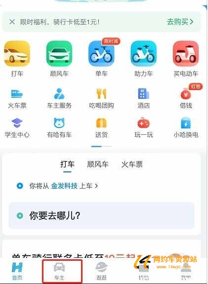 1、打开哈啰打车APP,登录进入主页后,点击下方功能栏的“车主”;